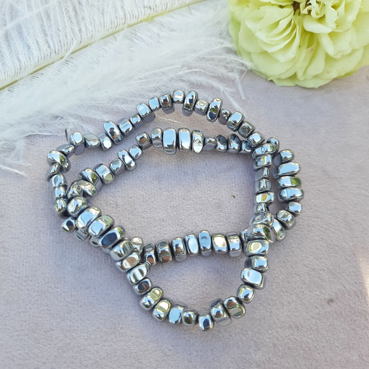 Бусини з натурального гематиту з сріблястим покриттям — універсальний вибір для стильних і виразних прикрас. Нестандартна форма (розмір від 4 до 8 мм) надає кожній нитці індивідуальність і динаміку. Холодний металевий блиск чудово поєднується з камінням, перлами та шкірою. Ідеальні для створення браслетів, кольє та декоративних акцентів з характером.