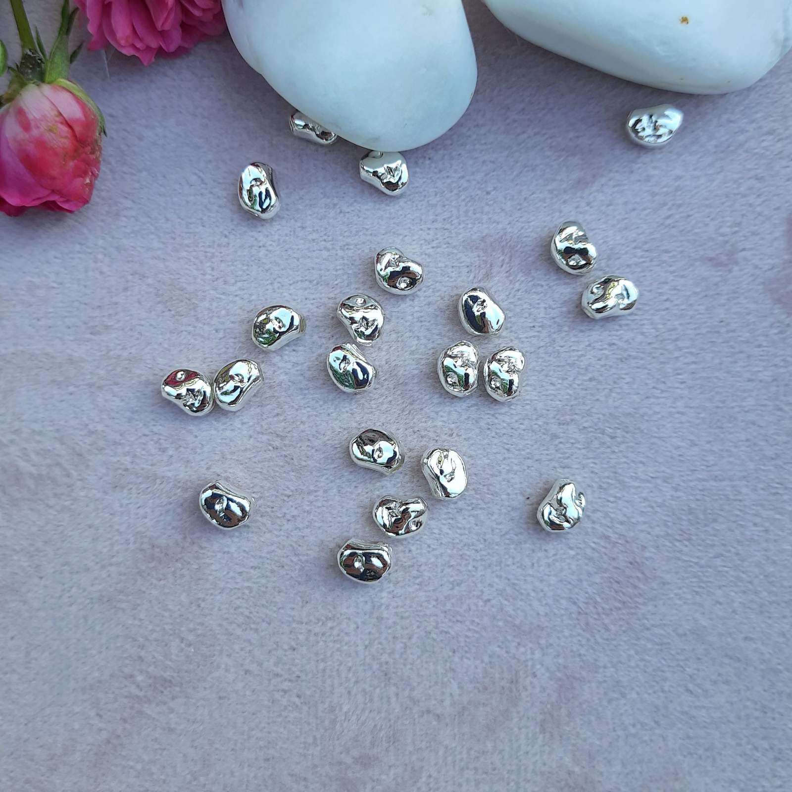 Металеві бусини для виготовлення прикрас. Мають діаметр 5 мм. та виконані у формі барокко. Можна використовувати як проставочні бусини, розділові або як однорідну вставку з кількох поспіль.
