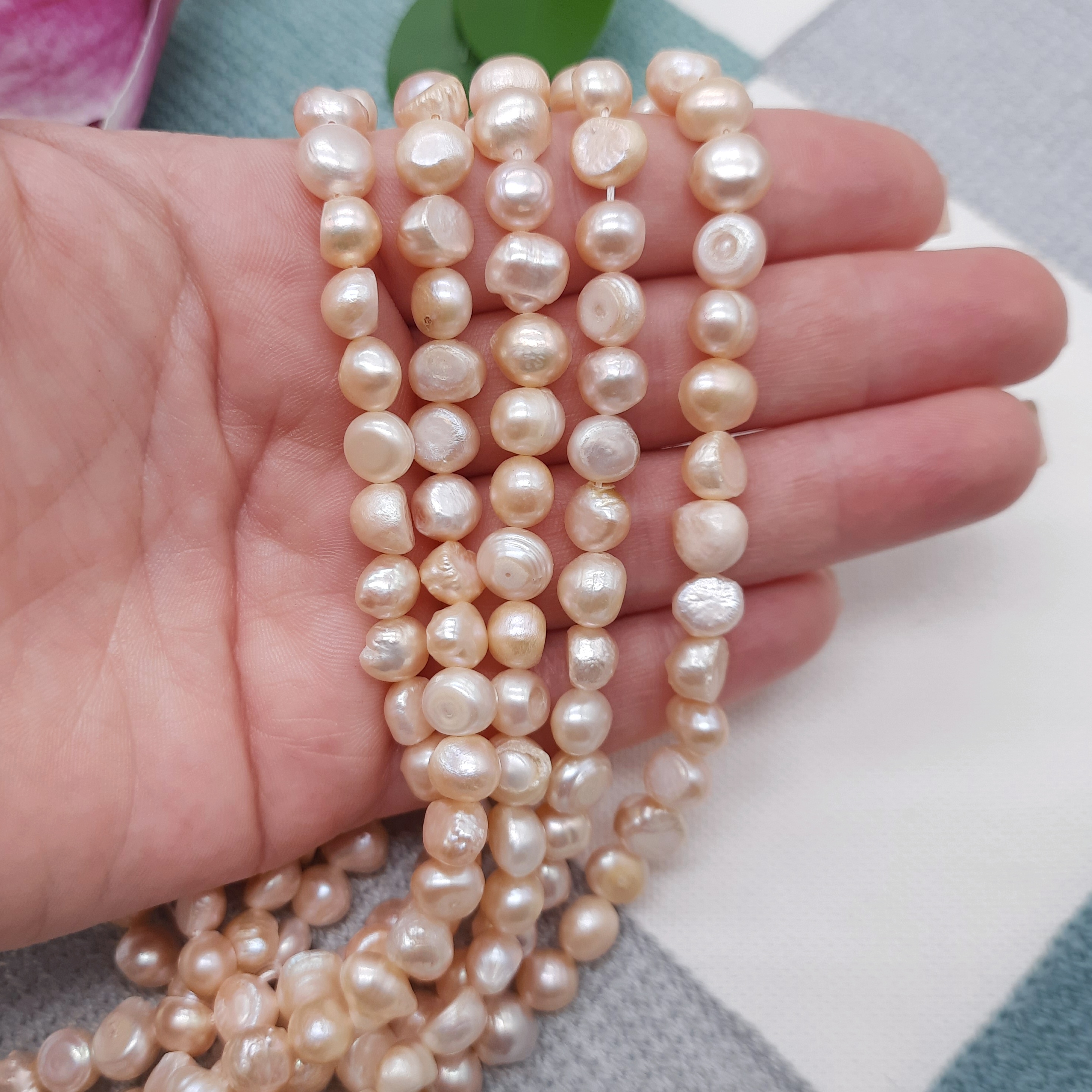 Нитка перлів для рукоділля, браслетів, намист, ювелірних виробів. Натуральні річкові перли вільної форми. Колір – ніжний рожевий. Натуральні перли неминуче мають вади на бусинах. Просимо враховувати перед розміщенням замовлення.