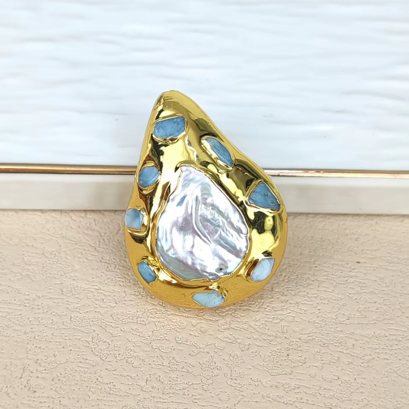 Золота оправа з гальванічним стійким покриттям обрамляє перли, створюючи ефект «рідкого металу», а ніжні блакитні акценти додають виробу глибини та вишуканості. Така намистина стане яскравим елементом в прикрасах ручної роботи та приверне увагу своїм незвичайним характером.