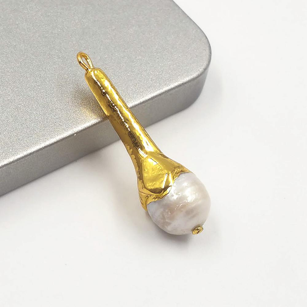 Кулон оригінальної форми з петелькою, виглядає стильно та дорого. Перли натуральні річкові. Кулон виготовляється вручну, тому довжина може бути від 40 мм до 45 мм. Покриття з латуні із позолотою 18K. Ціна за 1 шт.... Читати далі...