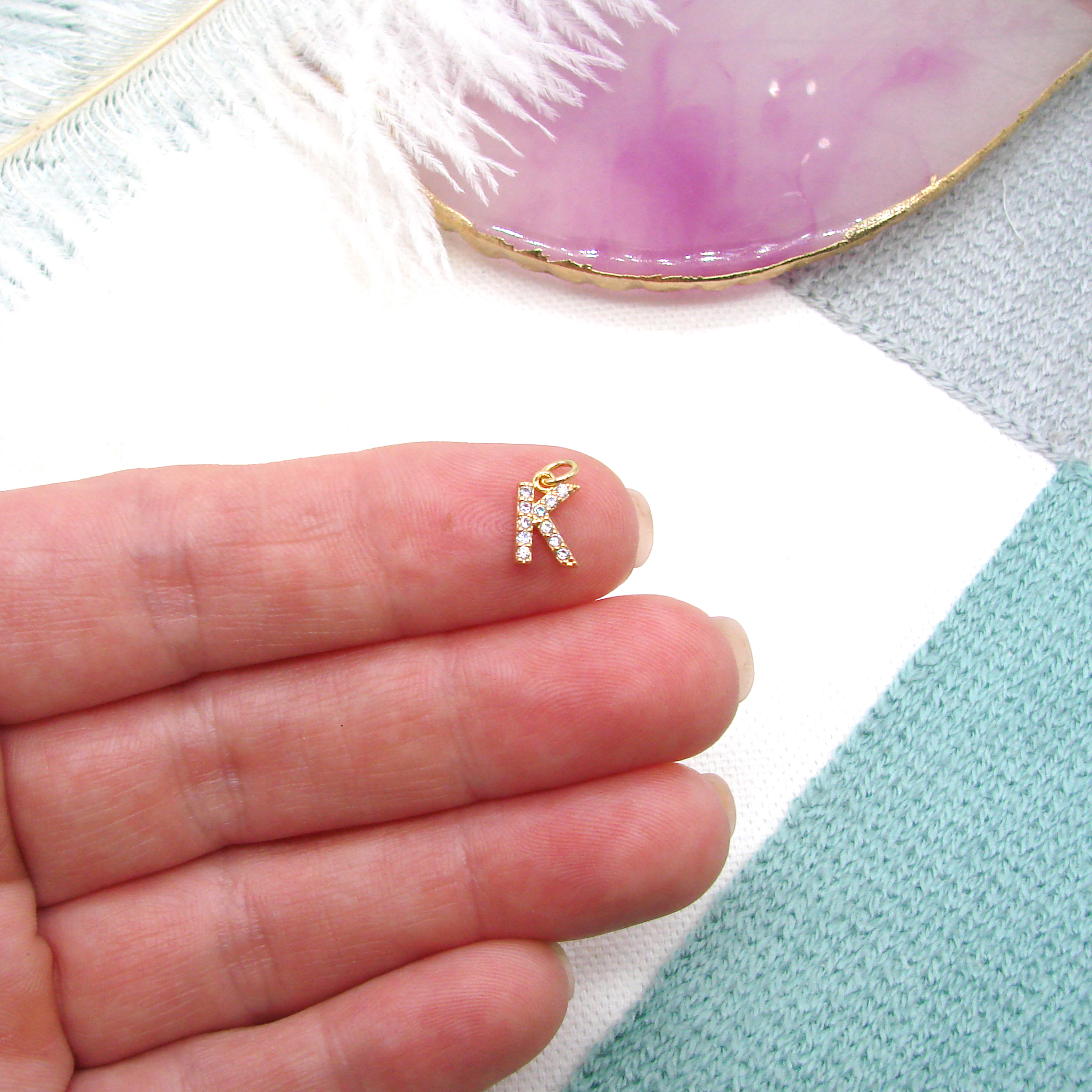 Кулон літера К з мікроінкрустацією фіанітами. Переливається та сяє. Підходить для комбінування з чокерами, ланцюжками, кольє.Матеріал: латунь з покриттям позолотою 18K.Висота: 11 мм.Ширина: 6 мм.... Читати далі...
