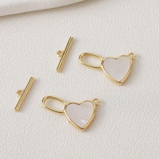 Застібка для ювелірних виробів. Складається з планки та кільця. Планка вставляється у кільце для фіксації прикраси. Цей тогл має вставку з перламутру у вигляді серця.