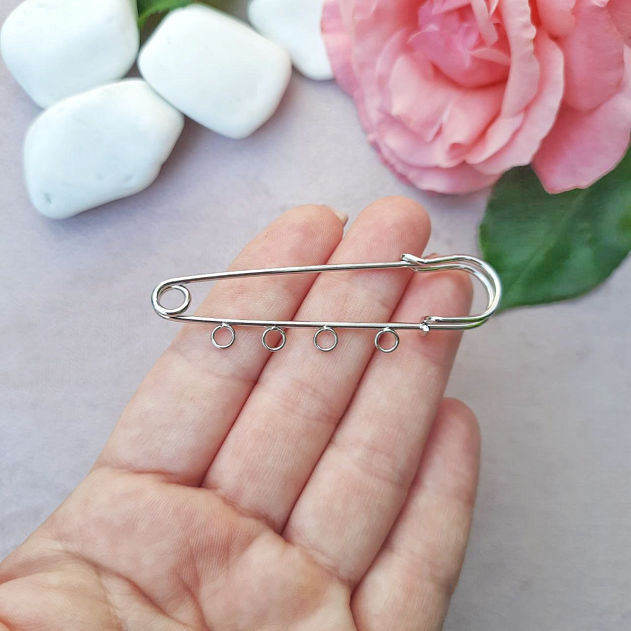 Ця основа у вигляді шпильки з чотирма кільцями ідеально підходить для створення оригінальних брошок і декоративних аксесуарів. Збільшений розмір 70х15 мм дає змогу реалізувати більш складні та виразні композиції. Платиновий відтінок надає готовому виробу елегантності та універсальності. Дуже добре поєднується з підвісками, намистинами та ланцюжками.