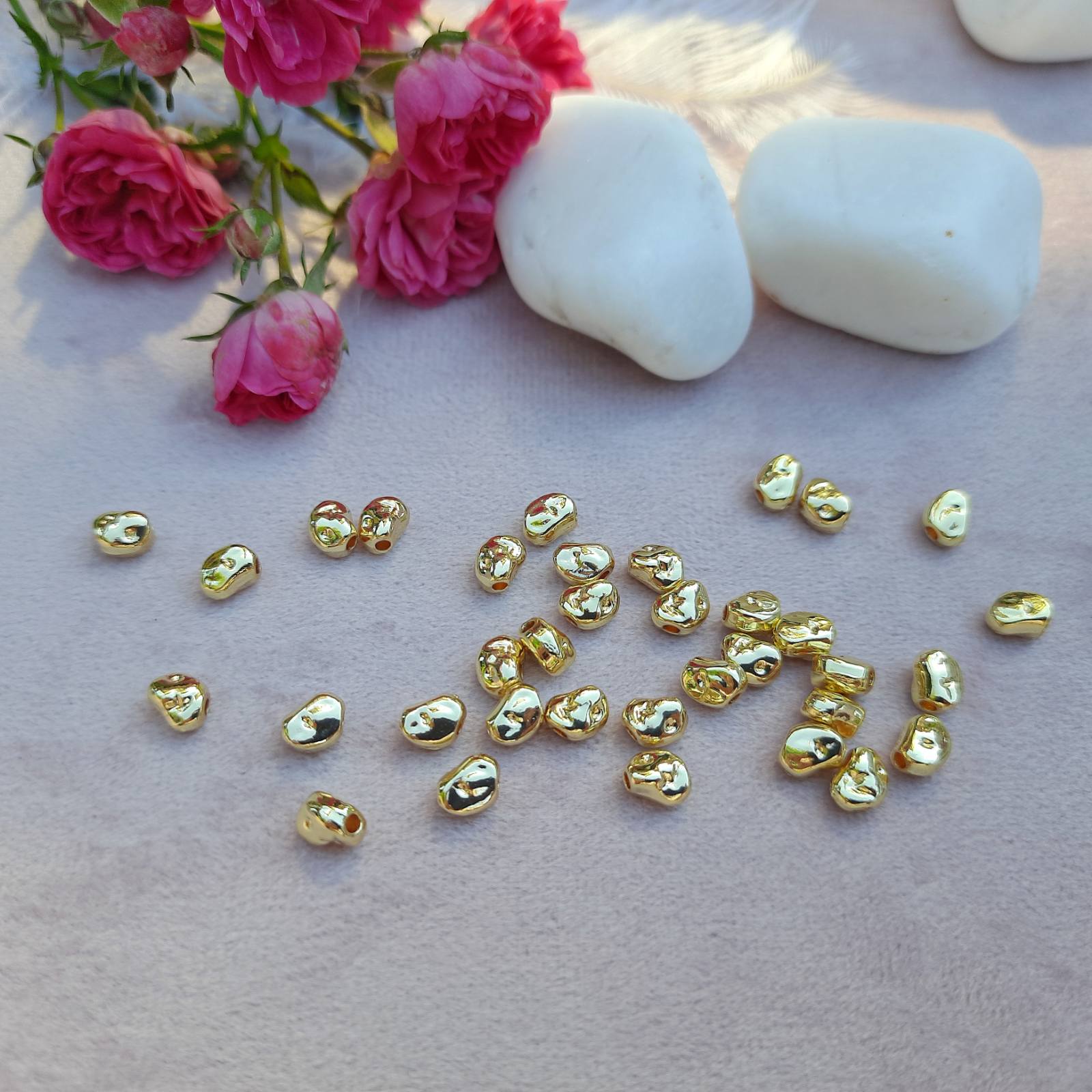 Металлические бусины для изготовления украшений. Имеют диаметр 5 мм. и выполнены в форме барокко. Можно использовать как проставочные бусины, разделительные или как однородную вставку из нескольких подряд.