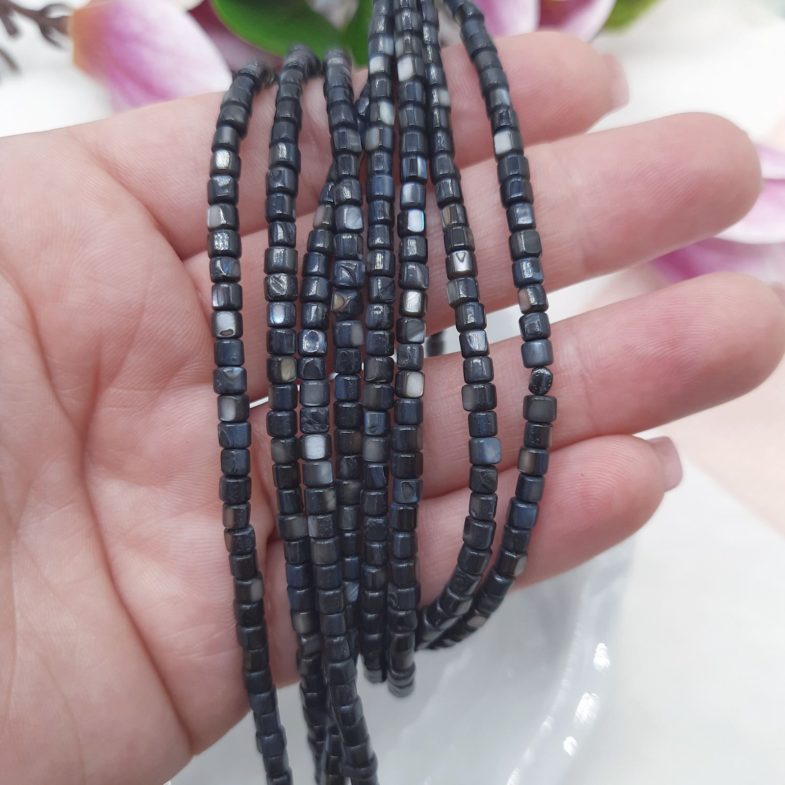 Перламутр в виде бусин-шайб черного цвета отличного качества и блеска. Натуральный перламутр используют в самых разных ювелирных украшениях - чокерах, браслетах, серьгах. Нить не имеет застежки. Перламутр предназначен для изготовления украшений.