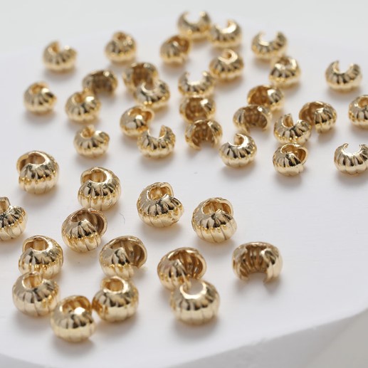 Применяются при изготовлении украшений для маскировки кримпов, узелков. После сжимания инструментом формируют бусину-шар. Возможно использовать как вставную бусину уже в готовое изделие, которое растянулось. Материал - латунь. Гальваническое покрытие 14K.