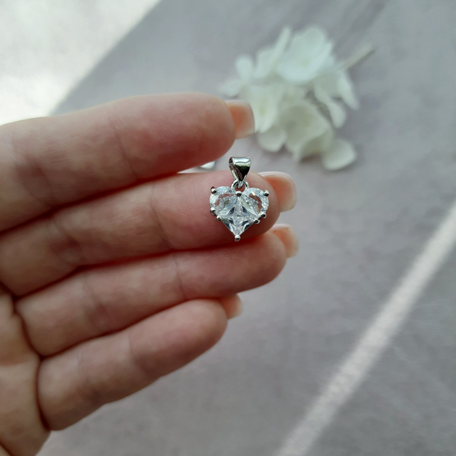 Роскошная подвеска в виде сердца с прозрачным кристаллом. Покрытие родием. Бейл в комплекте. Подходит для комбинирования с чокерами, цепочками, колье.