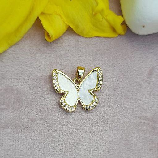 Подвеска в виде бабочки с бейлом, инкрустированная цирконием. Внутри вставка из натурального перламутра. Основа из латуни с покрытием позолотой 18К. Подходит для комбинирования с чокерами, цепочками, колье.