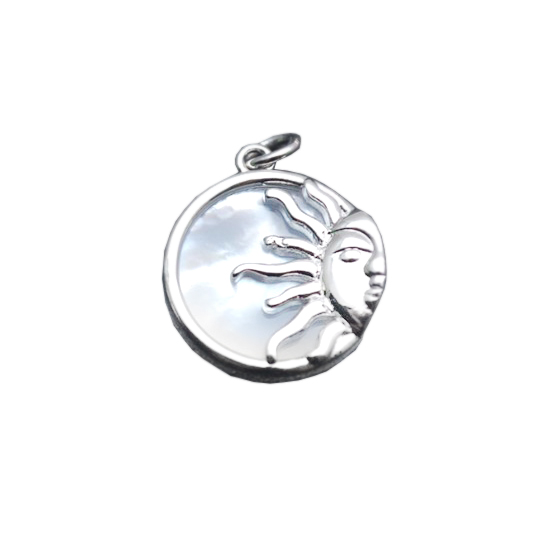Подвеска для использования в украшениях - колье, серьгах, браслетах. Имеет небольшой диаметр и оригинальный дизайн. Внутри вставка из натурального перламутра, основа выполнена из латуни с покрытием родием.