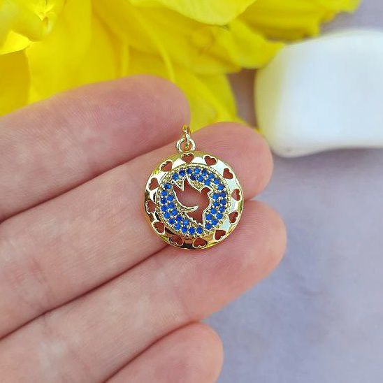 Позолоченный кулон покрытия 18К. Выполнен из латуни в форме круга с фианитами синего цвета. С кольцом в комплекте. Подходит для комбинирования с чокерами, цепочками, колье.