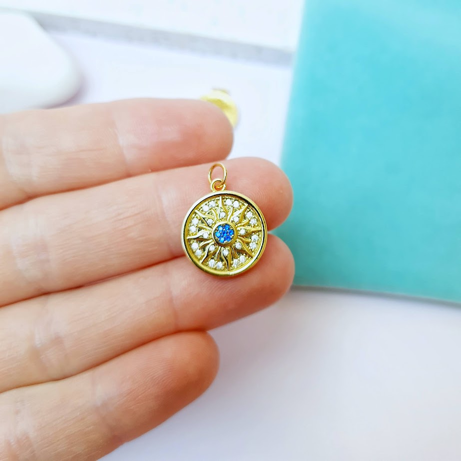Кулон для использования в украшениях - колье, серьги, браслеты. Имеет небольшой диаметр и оригинальный дизайн. Выполнен из латуни, покрытие 18К. Инкрустация кубическим цирконием. С кольцом в комплекте.