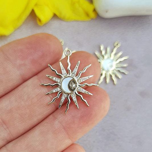 Подвеска в виде солнца, инскруктированная кубическим цирконием. Внутри вставка из натурального перламутра. Основа изготовлена из латуни с покрытием позолотой 18К. Подходит для комбинирования с чокерами, цепочками, колье.