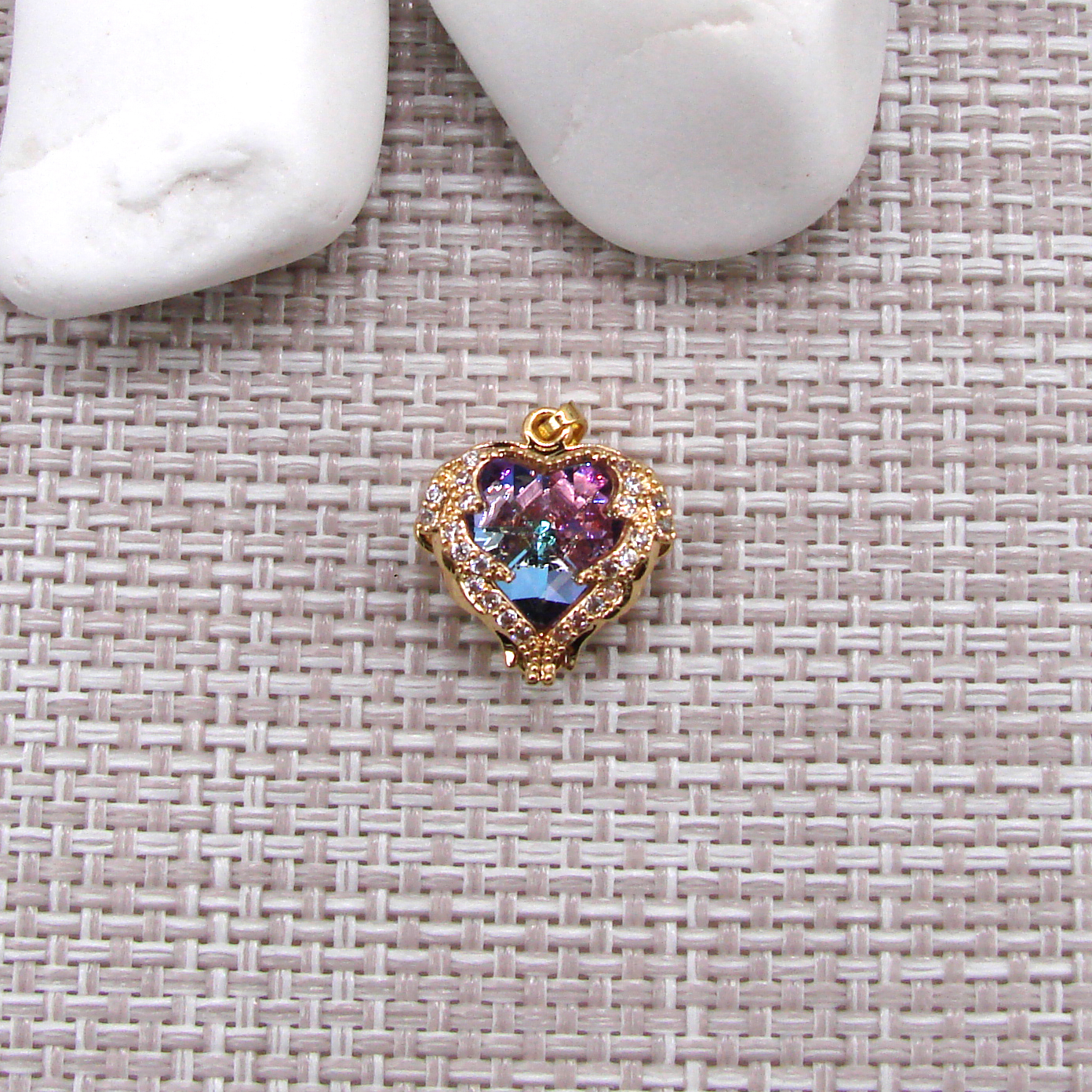 Роскошная подвеска с сияющим кристаллом, инкрустирована фианитами в технике Milano lux. Кристалл переливается разными цветами в розово-фиолетово-голубой гамме. Материал: латунь. Покрытие позолотой 18К.