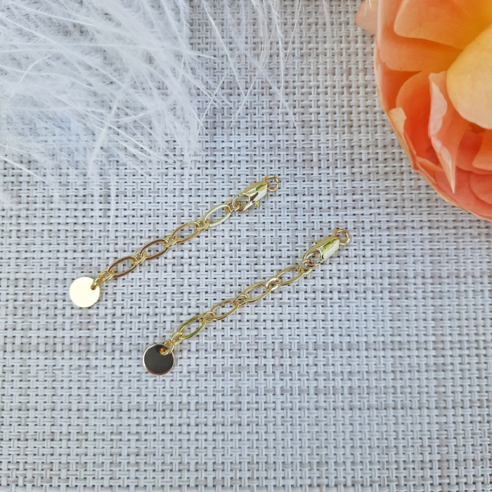 Фурнитура «два в одном» — надёжный карабин 10 мм с удлинительной цепочкой и круглым жетоном для декоративного акцента. Покрытие 18К придаёт изделию элегантный блеск золота. Идеально подходит для создания регулируемых браслетов, колье и чокеров. Готовое и стильное решение для завершения украшений.