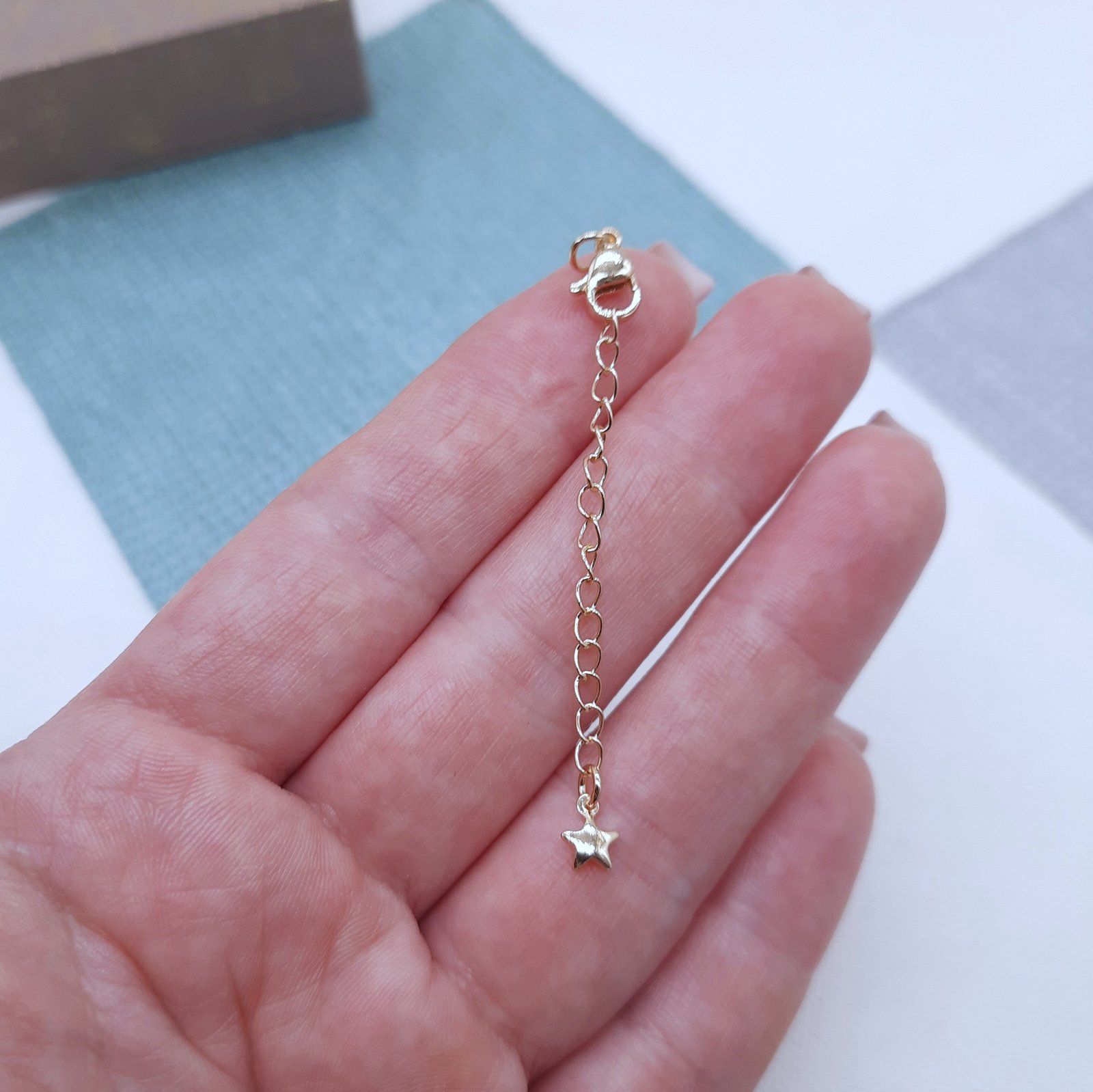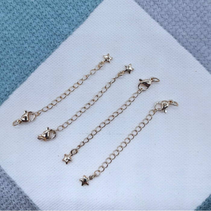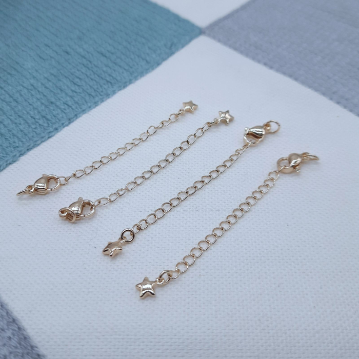 Небольшой карабин диаметром 10 мм в комплекте с удлинительной цепочкой — это именно тот элемент фурнитуры, который часто выручает при сборке браслетов и колье. Длина всей конструкции 65 мм, на конце — милая звездочка, которая смотрится как маленький декоративный акцент. Покрытие 14К придаёт мягкий золотистый оттенок, ровный металл хорошего качества. Покрытие стойкое гальваническое, не темнеет.
