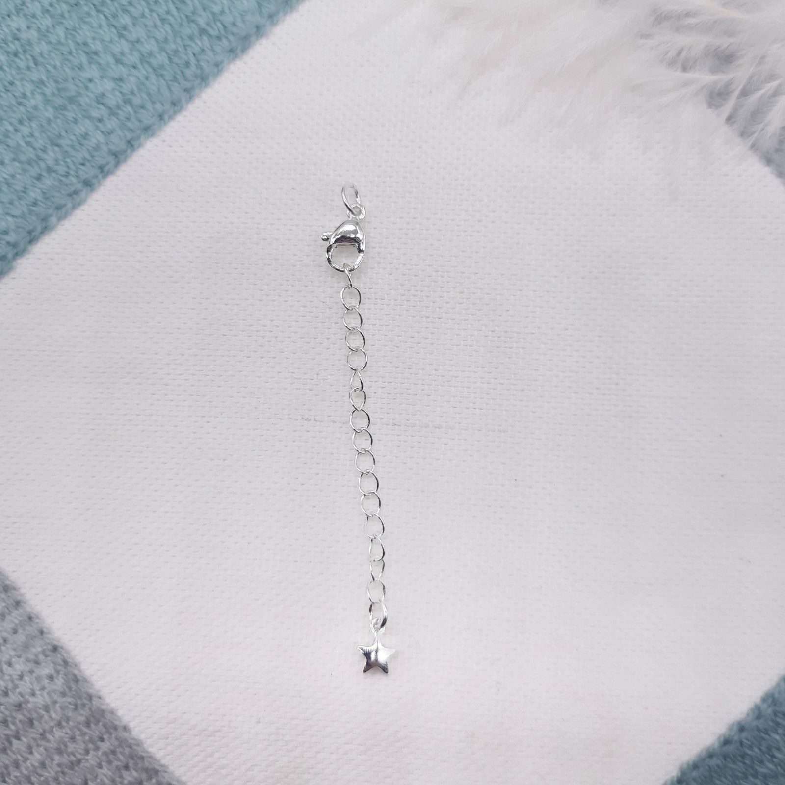 Небольшой карабин диаметром 10 мм в комплекте с удлинительной цепочкой — это именно тот элемент фурнитуры, который часто выручает при сборке браслетов и колье. Длина всей конструкции 65 мм, на конце — милая звездочка, который смотрится как маленький декоративный акцент. Покрытие родием придаёт мягкий серебристый оттенок, ровный металл хорошего качества.
