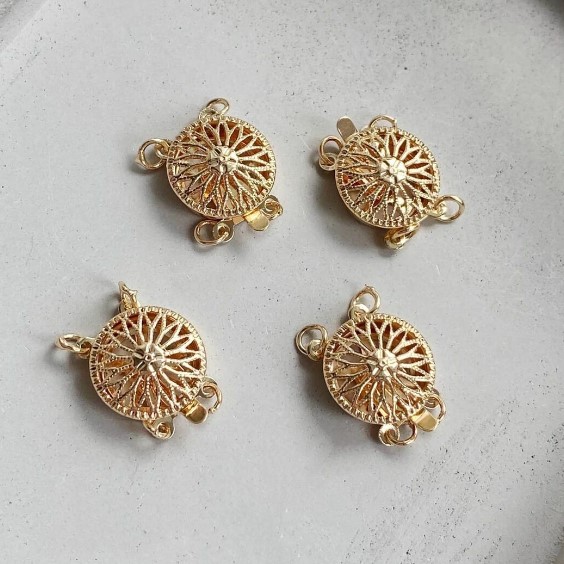 Стильный и функциональный круглый замочек, рассчитанный на два ряда бусин. Придаст шарм и элегантность любому изделию как в классическом так и в современном стиле.Материал: латунь с покрытием позолотой 18К.Диаметр 12 мм.... Читать далее...