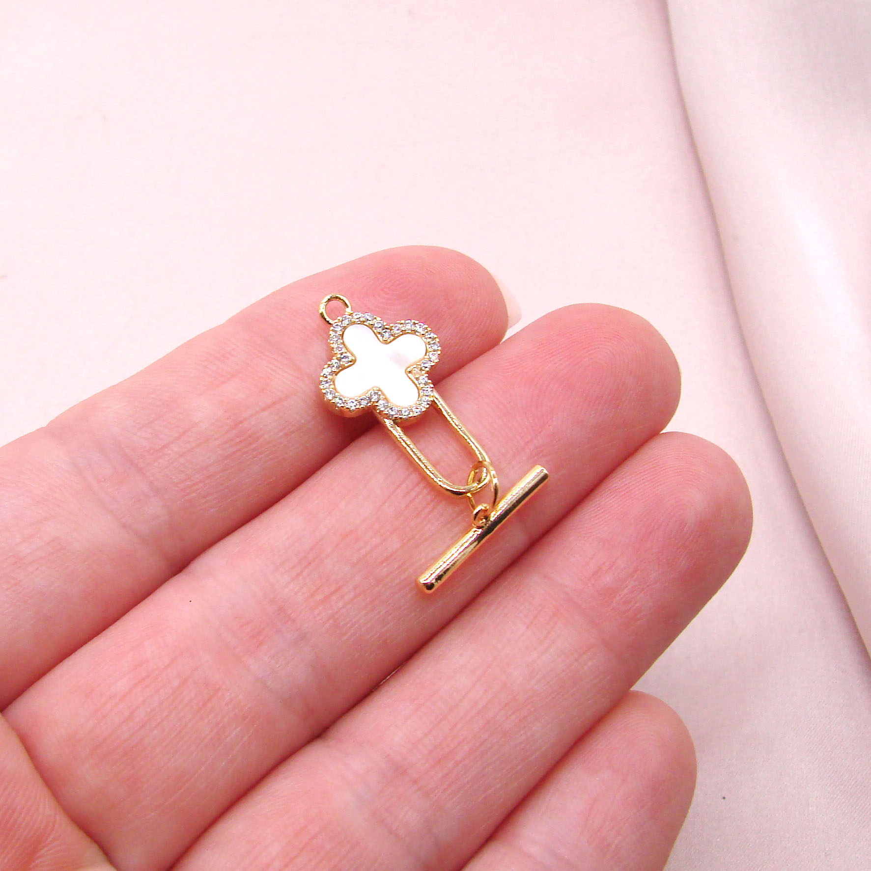Застежка для ювелирных изделий. Состоит из планки и кольца. Планка вставляется в кольцо для фиксации украшения. Данный тогл имеет вставку из перламутра в виде клевера.