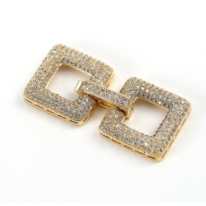 Элегантный замок для браслетов. Изготовлен из латуни с покрытием 18К, инкрустирован множеством фианитов (цирконов), которые красиво переливаются на свету. Такой замок станет не только функциональной частью украшения, но и его главным акцентом. Обеспечивает прочную фиксацию, роскошный внешний вид, подходит для создания вечерних украшений.